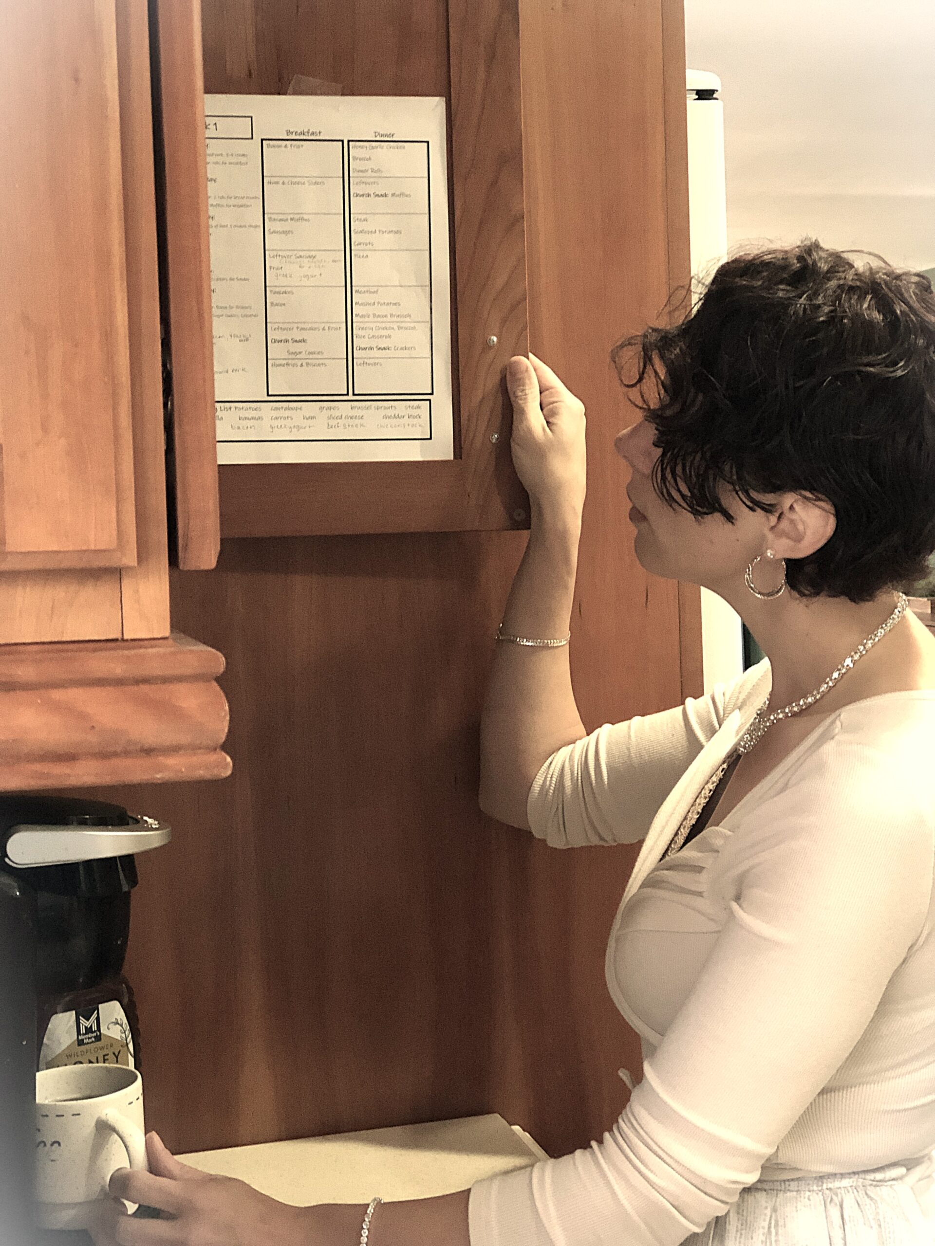 While that first cup of coffee is brewing, I also take a second to glance at my Thaw Schedule that I keep pasted to the inside of my cabinet! (I hate visual clutter, so the door of the fridge isn’t an option for me).