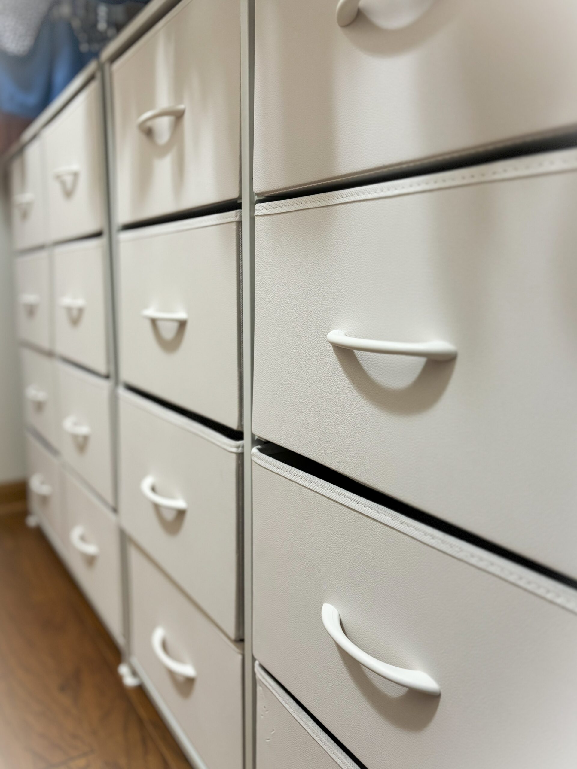 - Type: Each child has a column of four drawers (PJs, socks/tights, shorts, and pants). I let the drawers dictate how much clothing I can keep. Pick the favorite pants, and only keep what comfortably fits in that drawer. That will be plenty of clothing for each kid. Everything else—shirts, dresses, onesies—is hung by color.