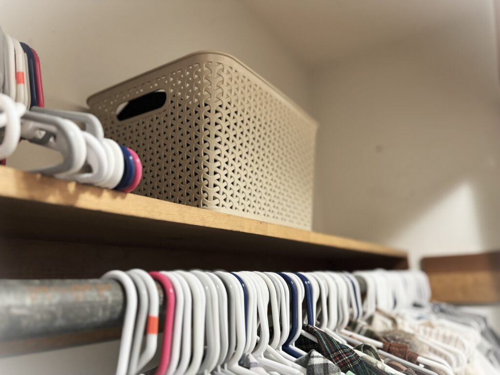 A small bin at the top of the closet is good for those items that are just a little too big for my two-year-old boy, but a little too small for my three-year-old. Those items are just on hold for a moment. I don’t want them in the drawers where I have to pass over them each day, but I also don’t want them so far away that I forget they exist. For items that are really the wrong size, like hand-me-downs from my older girls, those items are stored boxed in a closet in the little girls’ bedroom.